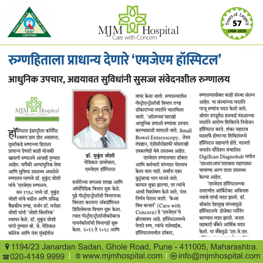 अभिमानाचा क्षण रुग्णहिताला प्राधान्य देणाऱ्या आमच्या एम.जे.एम हॉस्पिटल विषयीचा खास लेख स्थानिक वृत्तपत्रात प्रकाशित झाला आहे! रुग्णहिताला प्राधान्य देत आधुनिक वैद्यकीय तंत्रज्ञान, अनुभवी तज्ञ डॉक्टर आणि संवेदनशील सेवेद्वारे एमजेएम हॉस्पिटल रुग्णसेवेत नवे मापदंड निर्माण करत आहे. सुसज्ज ICU, NICU, अत्याधुनिक गॅस्ट्रोएन्टेरोलॉजी विभाग, Digiscan Diagnohub निदान केंद्र आणि NABH मानांकन ही आमची गुणवत्ता आणि विश्वासाची ओळख आहे. आमचा उद्देश एकच — रुग्णांच्या आरोग्याची जबाबदारी “Care with Concern” या तत्वावर पार पाडणे. Modern Healthcare with Human Touch — Advanced Facilities, Expert Doctors & NABH Accredited Services – all under one roof at MJM Hospital, Pune.